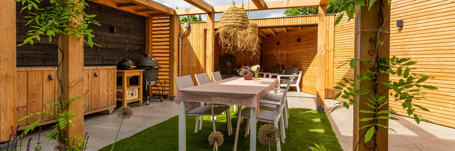 Een tuin om in te loungen, koken en lekker lang tafelen met vrienden en familie. De schutting van natuurlijk materiaal deelt de verschillende ruimtes in. Een verlengstuk van je huis, seizoen na seizoen.