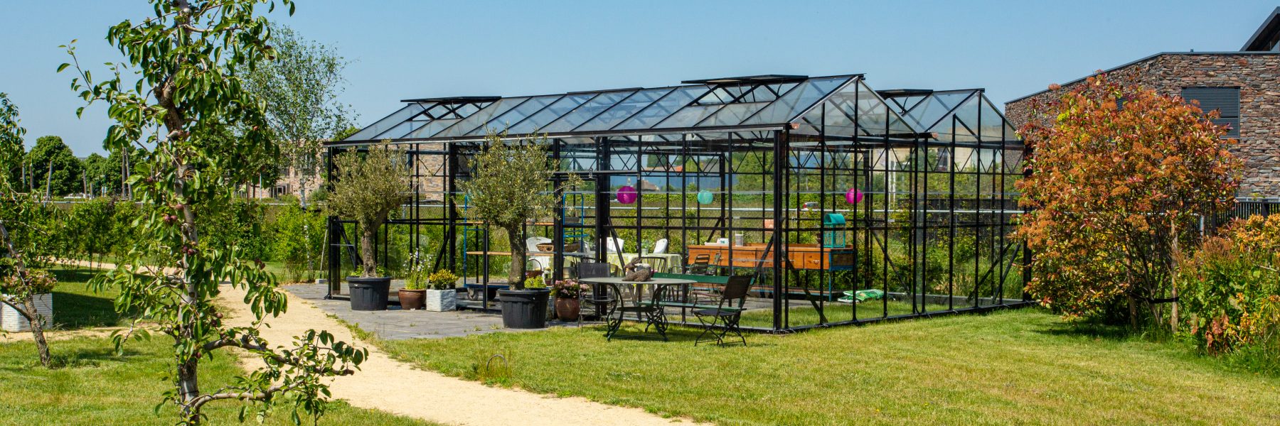 Een tuin van ruim 4000m2 als gemeenschappelijke leefomgeving waar de bewoners elkaar ontmoeten en zintuigen geprikkeld worden. Van een blote voeten pad tot dierenverblijf en ruime serre. In de pluktuin oogsten de groene vingers van het ‘dorp’ hun eigen kruiden, groente en fruit. De was wappert in de wind. Het ultieme dorpsgevoel binnen en buiten.