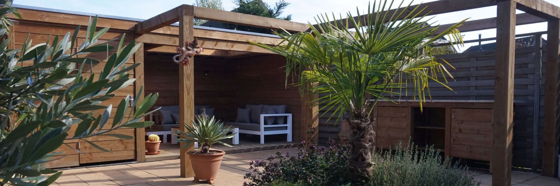 Een tuin waar je je het hele jaar op vakantie waant. Warme kleuren, een buitenkeuken en een buitenkas. De tuineigenaar had duidelijke wensen die onze ontwerper vertaald heeft naar een mediterraan ontwerp met beplanting en een mozaïek in zuidelijke sferen.