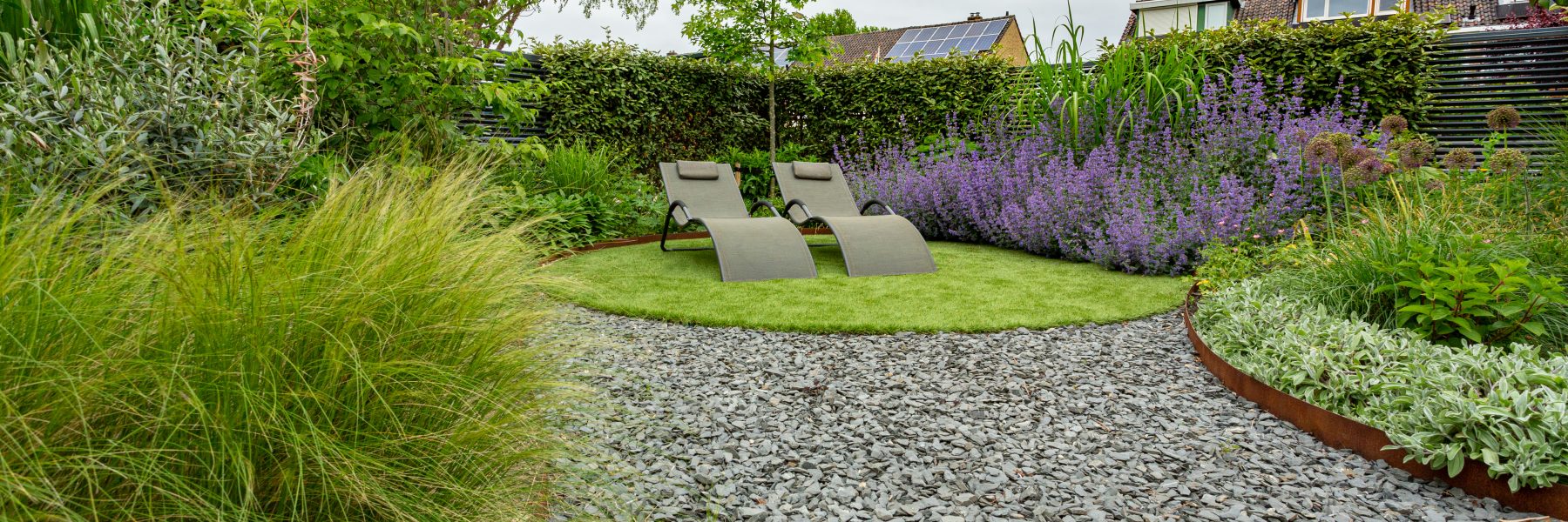 Een onderhoudsarme tuin tot op de vierkante meter gericht op ontspanning en een gevoel van luxe. Ronde belijningen die zich herhalen in cortenstaal, verlichting en groen.