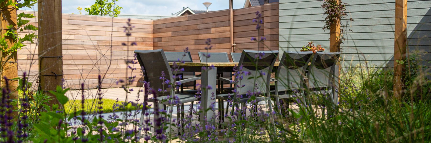 De lijnen in de schutting leiden je blik door deze tuin vol rustgevende, zachte kleuren. Natuurlijke materialen, strakke lijnen en subtiel groen maken deze tuin tot een onderhouds- en prikkelarme plek om bij te komen van hectische dagen.
