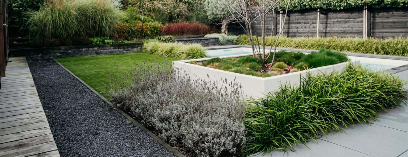 Volledig ontspannen in het groen. Strakke lijnen, rustgevende beplanting en een zwembad zorgen voor het ultieme wellness gevoel.