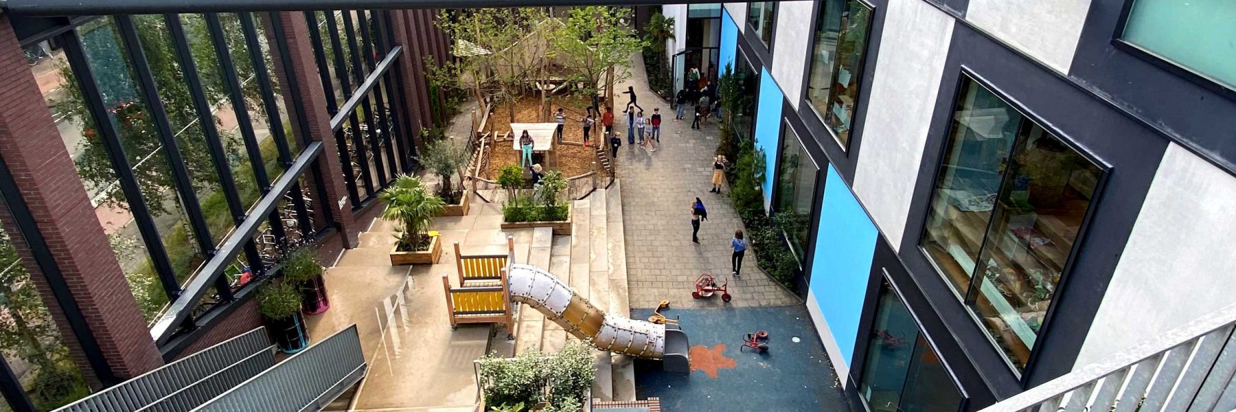 Voor de helden van deze school een plein vol groen op verschillende hoogtes. De zorgvuldig gekozen beplanting biedt verkoeling tegen de warmte die op de in glas gehulde locatie volop aanwezig is. Er wordt gerend, geklommen, verstopt en ontdekt. Voetballen doen ze hier op grote hoogte dankzij het speelveld dat op het dak is gerealiseerd.